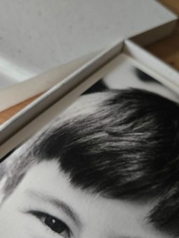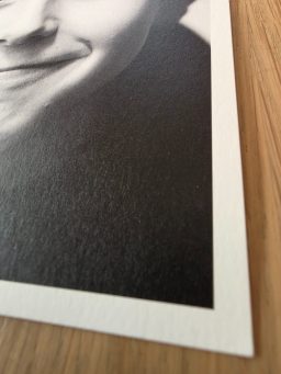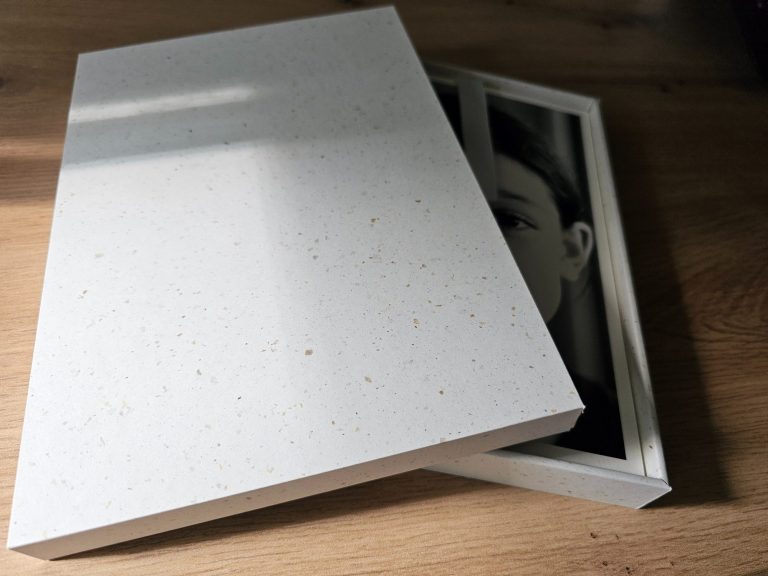 Tirages professionnels format 15x23 cm sur papier épais Mohawk Eggshell 324 g/m², présentés dans leur coffret terrazzo